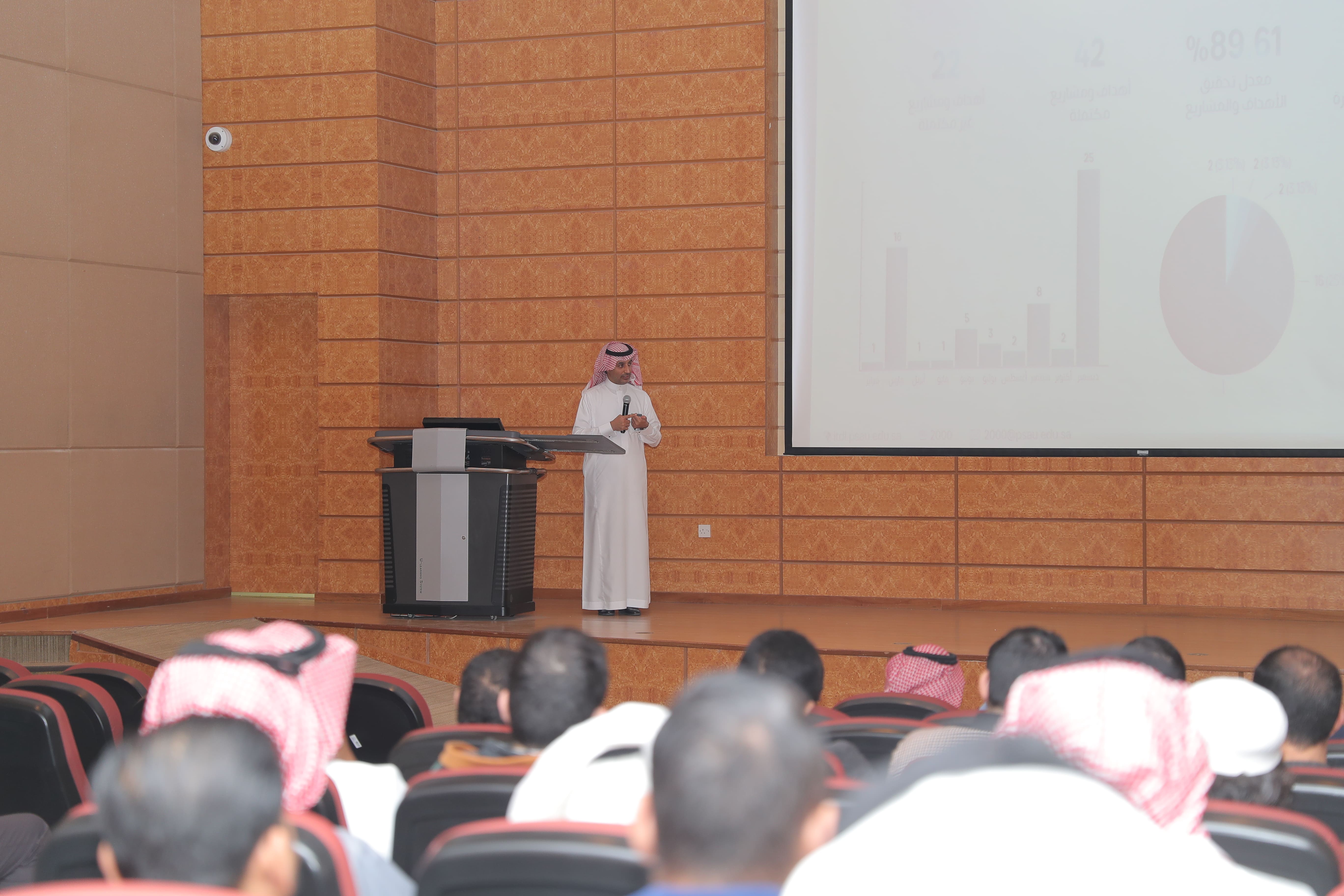 بحضور سعادة وكيل الجامعة الدكتور رائد بن عبدالله اليوسف ومنسوبي الإدارة العامة لتقنية المعلومات استعرض مدير عام تقنية المعلومات بالجامعة الأستاذ وليد بن محمد السليطين خلال اللقاء الذي أقيم في يوم الأربعاء 5 رجب 1445هـ الموافق 17 يناير 2024م بمسرح كلية الهندسة حصاد الإنجازات والأهداف والمشاريع للإدارة خلال العام الماضي 2023م، حيث حققت الإدارة عدداً من الإنجازات النوعية. مؤكداً أن هذه الإنجازات تحققت أولاً بفضل الله عز وجل ثم بفضل الكفاءات المتميزة التي تضمها الإدارة والتي كان أساس العمل لديها روح المثابرة والشغف، والعمل الجماعي، وبلغت نسبة تحقيق الأهداف والمشاريع 89.61% من خلال 64 هدف تنفيذي ومشروع، ولفت الأستاذ وليد إلى أن المبادرات التي أطلقتها الإدارة خلال العام الماضي شكلت رافداً أساسياً في طريق تحقيق الأهداف الاستراتيجية للإدارة والجامعة.