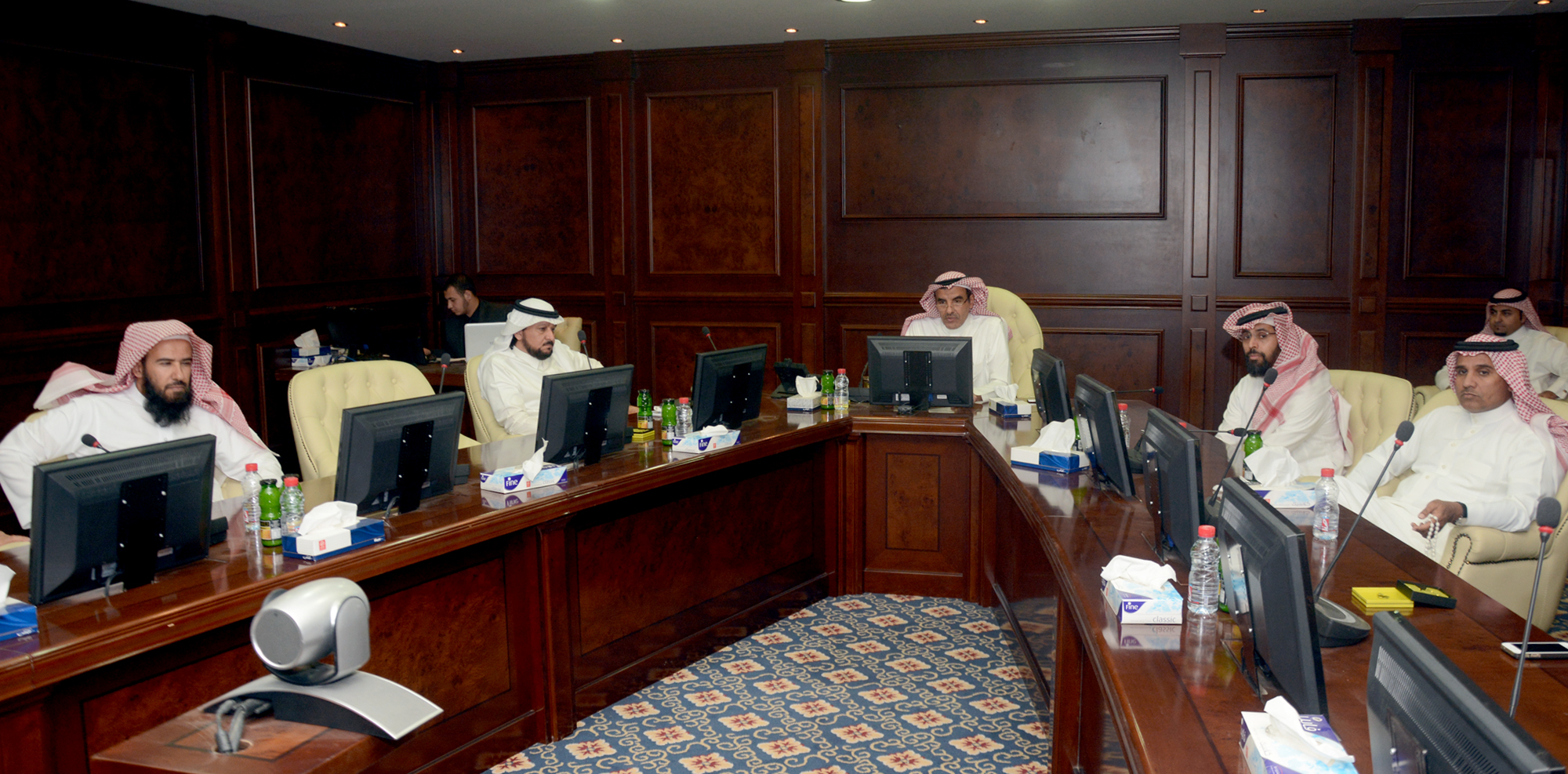 في إطار السعي المستمر لتحسين وتطوير الخدمات؛ والاستجابة المستمرة لمتطلبات مجتمع الجامعة من قطاعات وأعضاء هيئة تدريس وموظفين دشن معالي مدير الجامعة د. عبدالرحمن بن محمد العاصمي حزمة جديدة من الأنظمة والخدمات الإلكترونية والمشاريع والتحسينات التي طورتها عمادة تقنية المعلومات والتعليم عن بعد؛ وذلك بحضور سعادة وكيل الجامعة الدكتور عبد الله الجمعة وسعادة وكيل الجامعة للدراسات العليا والبحث العلمي الأستاذ الدكتور عبد العزيز بن عبد الله الحامد وعدد من أصحاب السعادة العمداء وأعضاء لجنة التعاملات الالكترونية , وذلك يوم الأحد 18 ربيع اخر 1436 الموافق 8/2/2015 في قاعة مجلس الجامعة. حيث استهل اللقاء بعرض تقديمي من سعادة د.محمد بن سعيد القحطاني؛ عميد تقنية المعلومات والتعليم عن بعد استعرض فيه الجديد على صعيد النظم والخدمات الالكترونية، والبنية التحتية وتقنيات التعليم والتعلم الالكتروني. ففي مجال الأنظمة والخدمات تم إطلاق وتدشين ثمانية نظم وخدمات إلكترونية لخدمة كافة قطاعات مجتمع الجامعة بهدف التقليل من الجهد والكلفة والمساهمة في التحول نحو الجامعة الذكية. وشملت هذه النظم والخدمات مايلي:نظام الإجازات: والذي من خلاله يتمكن الموظفون وأعضاء هيئة التدريس من تقديم إجازاتهم الى رؤسائهم المباشرين للحصول على الموافقات وعبره يتم احتساب رصيد إجازات الموظف والحصول على قرار الإجازة إلكترونياً من عمادة شؤون الموظفين حيث تم ربطه بالنظام المالي والإداري.نظام الأداء الوظيفي: ليحول عمليات إجراء التقييم الوظيفي من تصميم للاستبيانات الورقية وإدارتها واحتساب نتائجها من النمط الورقي التقليدي الى النمط الالكتروني.نظام الهيكلة الإدارية للجامعة: يوفر هذا النظام بناء الهيكل الإداري للجامعة إلكترونياً وتسكين موظفي الجامعة عليه بشكل مرن ليتمكن مسؤولو الجامعة كلٌ في موقعه في الهرم الإداري من اعتماد التوصيات والموافقات إلكترونياً لكافة الخدمات الإدارية الأخرى، ويمكن المسؤول الأول للجهة من إجراء النقل الداخلي للموظف من إدارة الى إدارة متى ما أراد.خدمات المتعاونين: من خلالها تتمكن لجنة المتعاونين من اعتماد ساعات التعاون الأسبوعية لكل عضو هيئة تدريس متعاون سواء من داخل الجامعة أو من خارجها، وكذلك تتيح لرؤساء الأقسام وعمداء الكليات متابعة عمل الأعضاء المتعاونين وتسجيل عدد الساعات الفعلية لهم تمهيداً لإصدار مسيراتهم الشهرية.خدمة إخلاء الطرف: تأتي كخطوة أخرى نحو الجامعة الذكية حيث تختصر إلكترونياً الجهد والإجراءات التقليدية التي يبذلها الموظف عند النقل أو إنهاء الخدمات أو التقاعد وما يتضمن ذلك من تسليم عهد وصلاحيات.نظام حجز القاعات والمسارح: يتم من خلاله البحث عن القاعات الشاغرة حسب الموعد المحدد وإنهاء جميع إجراءات حجزها إلكترونياً وكذلك الاطلاع على بيانات عن حالة الحجز عند قبوله أو رفضه.خدمات الأجهزة الهاتفية: يهدف هذا النظام إلى تمكين المستفيدين من الحصول على الخدمات والأجهزة الهاتفية عن طريق منسق الجهة التابعين لها.ربط هاتف الموظف بتطبيق الاتصالات المرئية: تتيح هذه الخدمة التواصل مع زملاء العمل من خلال المكالمات المرئية أو المحادثات النصية، كما تمكن من إجراء واستقبال المكالمات المحلية والخارجية حسب صلاحية المستخدم.علاوة على ذلك فقد دشن معالي الدكتور العاصمي عدد من المشاريع الخدمية وذلك بعد ان استعرضها سعادة الدكتور القحطاني وهي:مشروع الشبكة اللاسلكية للمدينة الجامعية (المرحلة الأولى): حيث يوفر المشروع الشبكة اللاسلكية داخل المدينة الجامعية وتشمل الكليات القائمة والمرافق التابعة لها وإسكان أعضاء هيئة التدريس. وذلك بتركيب (619) جهاز لاسلكي موزعة على مبنى كلية المجتمع ومبنى كلية العلوم والدراسات الإنسانية وكلية الهندسة وكلية العلوم الطبية التطبيقية ومباني إسكان أعضاء هيئة التدريس والمرافق.مشروع الاستديوهات التعليمية والقاعات الذكية: وقد شمل المشروع تجهيز عدد (2